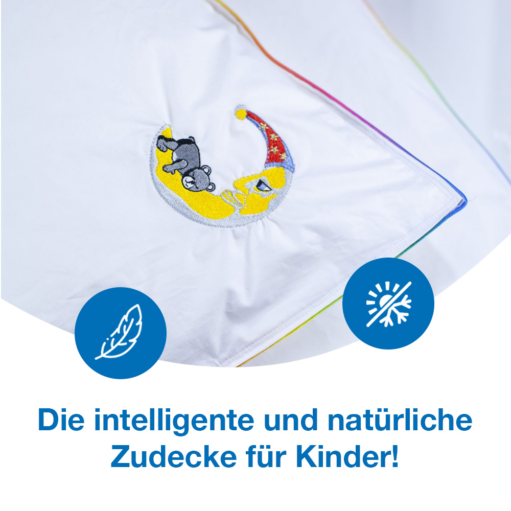 Traumhafte Daunendecke für für erholsame Kindernächte! Leicht, atmungsaktiv und temperaturausgleichen. Wir befüllen unsere ZIPFL'S RUBIN ausschließlich mit ausgewählter regionaler Gänsedaune. Das feine Inlett aus 100% Baumwolle runden den Komfort dieser Kinderdecke ab. In den Größen 80x80cm (z.B. für den Kinder- oder Stubenwagen) und 100x135cm (für das Kinderbett) erhältlich.