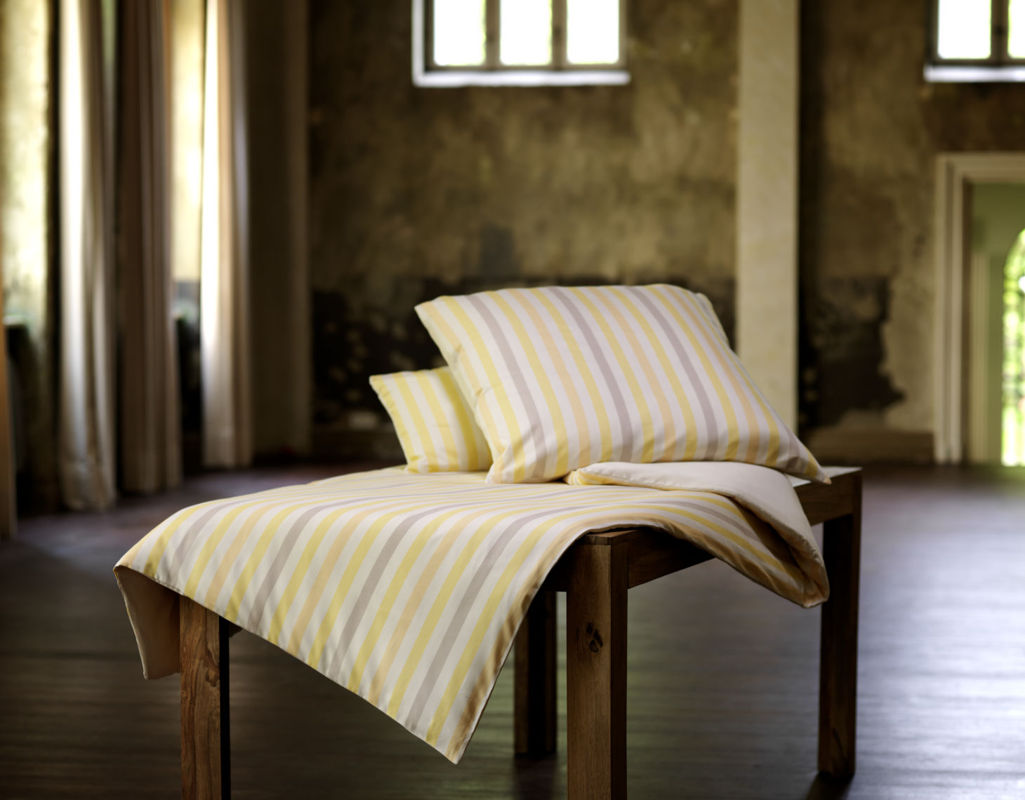 Die Wendebettwäsche Linell aus Bio-Satin ist ein Buntgewebe, ohne dabei wirklich bunt zu sein. Das regelmäßige Streifenmuster auf der Vorderseite und die naturfarbene Unterseite heben die Eleganz des Linell deutlich hervor. Anders als bei herkömmlichen Bettwäschen erhält das glatte und leicht simmernde Satin-Gewebe sein Muster durch das Weben mit unterschiedlich gefärbten Garnen. Dadurch entsteht eine bildschöne Präzision in Form von Streifen, welche sich alle 2,5 cm abwechseln. Je nach Farbzusammenstellung lassen sich mit der gestreiften Baumwollbettwäsche unterschiedliche Stimmungen kreieren. Dabei erzeugt die Farbgruppe in Gelbtönen eine wohlig warme und die Komposition in Grautönen eine angenehm kühle Atmosphäre. Alle Farbvariationen können auch nach Lust und Laune individuell miteinander kombiniert werden.