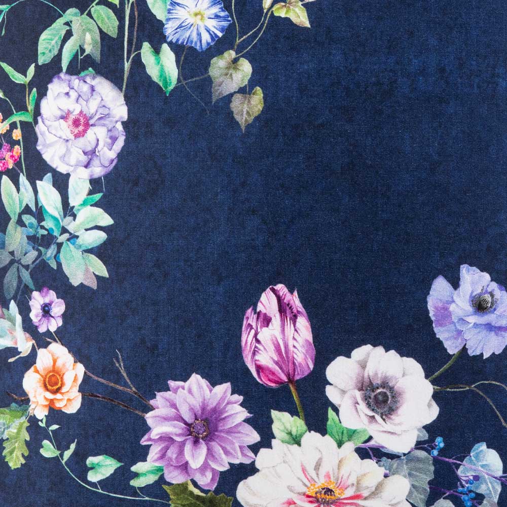 Blumig, edel, stilvoll: Mit den dekorativen Kissenbezügen Euphoria verleihen Sie Ihrem Zuhause den letzten Schliff. Der nachtblaue Mako-Satin ist ein echter Handschmeichler. Auf ihm präsentiert sich ein zartes Blumenmotiv, das als elegante Ranke drei der vier Kissenecken dekorativ umrahmt. Zusätzlich veredelt eine 4-seitige Paspel in auffallend abgesetzter Kontrastfarbe die hochwertig verarbeiteten Kissenkanten.