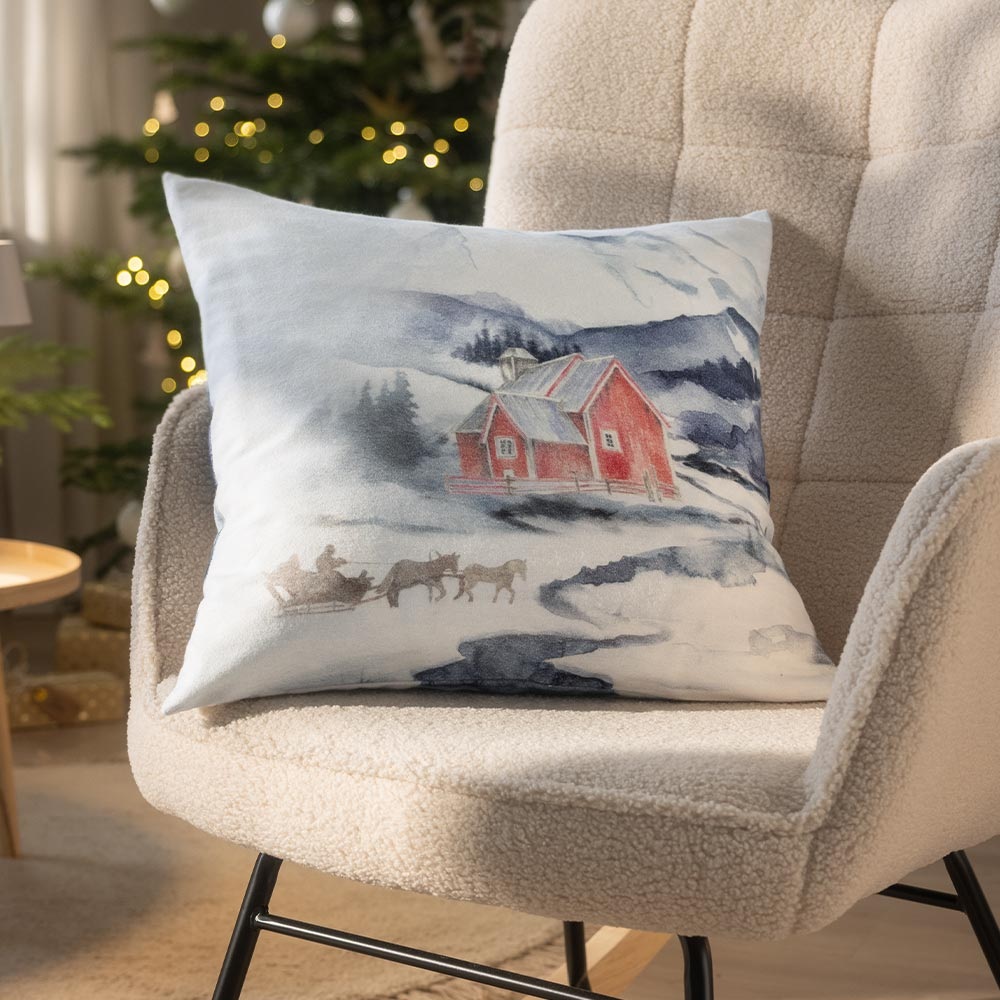 Der Dekokissenbezug „Sleigh Ride“ in der Farbe Schnee entführt dich in eine verschneite Winterwelt voller Geborgenheit. Das feine Aquarellmotiv zeigt eine rote Hütte vor winterlicher Bergkulisse, ergänzt durch einen Pferdeschlitten, der behutsam durch die Schneelandschaft gleitet – ein Bild voller Ruhe, Wärme und Nostalgie.