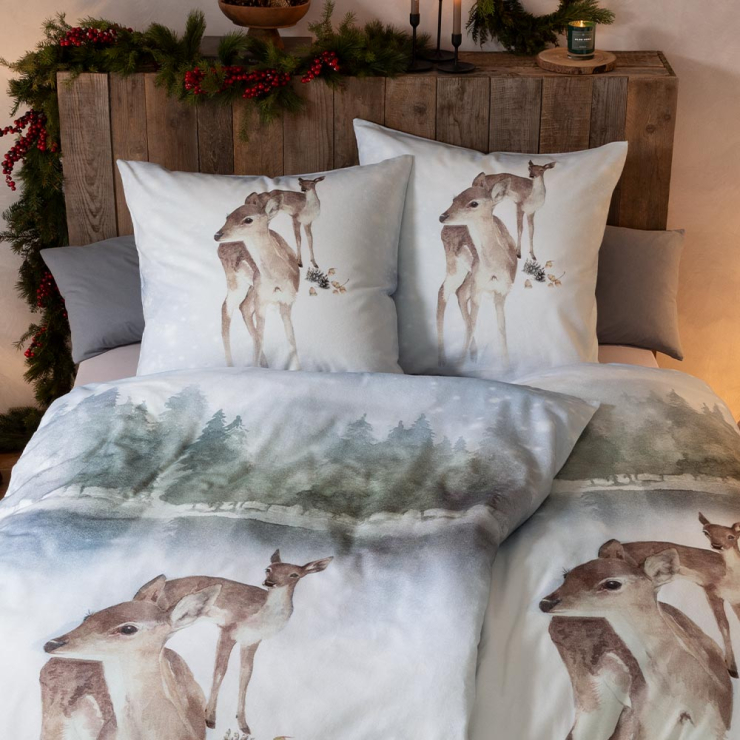 Wohlig warm schlafen im verschneiten Winterwald: Mit den Bezügen der Garnitur Iceland wird dieser Traum nun Wirklichkeit. Der Basisfarbton Schnee verleiht der Bettwäsche eine kuschelige Anmutung. Ihr bildhafter Aufdruckt beeindruckt indes mit zwei liebevoll gestalteten Rehen, die anmutig im tiefen Schnee stehen und ihren Betrachtern entgegenblicken. Ein im Hintergrund weich schattierter, dunkelgrüner Wald macht das Winterzauber-Bettwäscheset komplett und verleiht ihm den letzten Schliff.Flanell ist der Stoff mit dem besonderen Oberflächenflausch. Das einseitig aufgeraute Material eignet sich ausgesprochen gut für die Verwendung in der kalten Jahreszeit. Unsere Kuschelflanell-Bettwäsche wird aus Baumwolle (Nm 33/1, supergekämmt) hergestellt. Dies bedeutet, dass 33 Meter des verwendeten Garns insgesamt nur 1 Gramm wiegen.