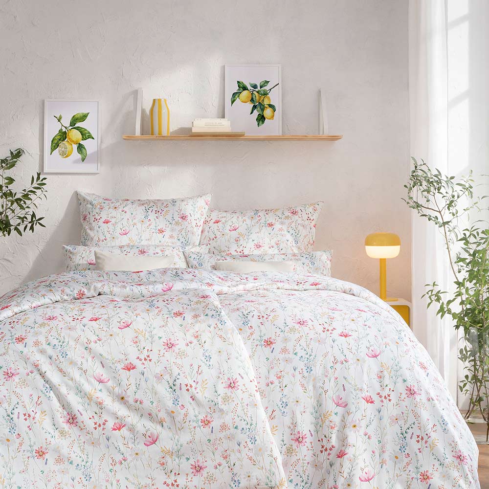 Romantisch und verspielt: Die Bezüge der Garnitur Celeste präsentieren sich mit zarten Blumenranken in sanftem Pink und frischen Grüntönen. Der blühende Sommergarten für deine Räumlichkeiten fügt sich somit ausgezeichnet in moderne Landhaus- oder klassische skandinavische Einrichtungsstile ein, die natürliche Materialien und helle Farben bevorzugen.