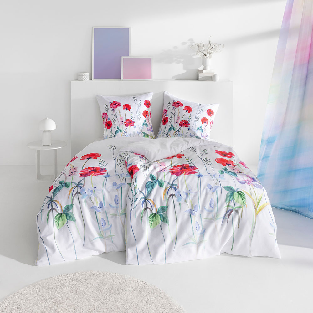 Roter Klatschmohn lässt grüßen – auf den Kissen- und Bettdeckenbezügen der Garnitur Christy. Dank des Blumendekors in leuchtendem Rot, Blau und Grün auf weißem Hintergrund erzeugt das Set eine frühlingshafte Ästhetik. Die zarten Blüten und filigranen Stängel wirken wie ein kunstvolles Aquarell, das individuell kombiniert mit silbernen oder jadefarbenen Accessoires noch einmal mehr zu Geltung kommt.