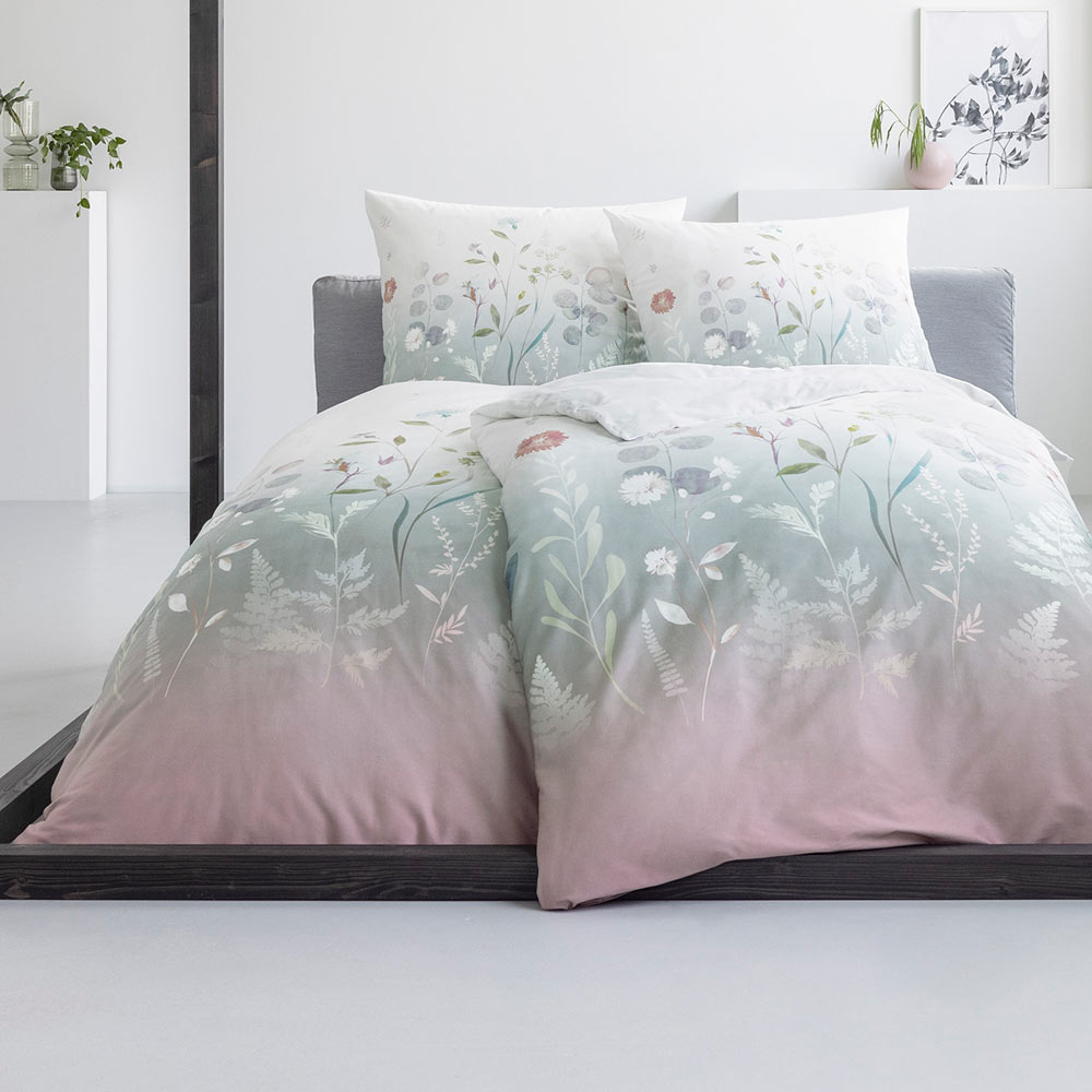 Ein Bettwäschetraum in Pastell zieht mit den Kopfkissen- und Bettdeckenbezügen der Garnitur Flowery in deine vier Wände ein. Das Set besticht durch einen zarten Farbverlauf von Rosa zu Blaugrau bis Weiß. On top tritt ein frühlingshafter Wald- und Wiesenaufdruck leise aus den kuschelweichen Maschen hervor. So entsteht eine rundum verträumte und zugleich besonders frische Optik, die jeden Raum erhellt.