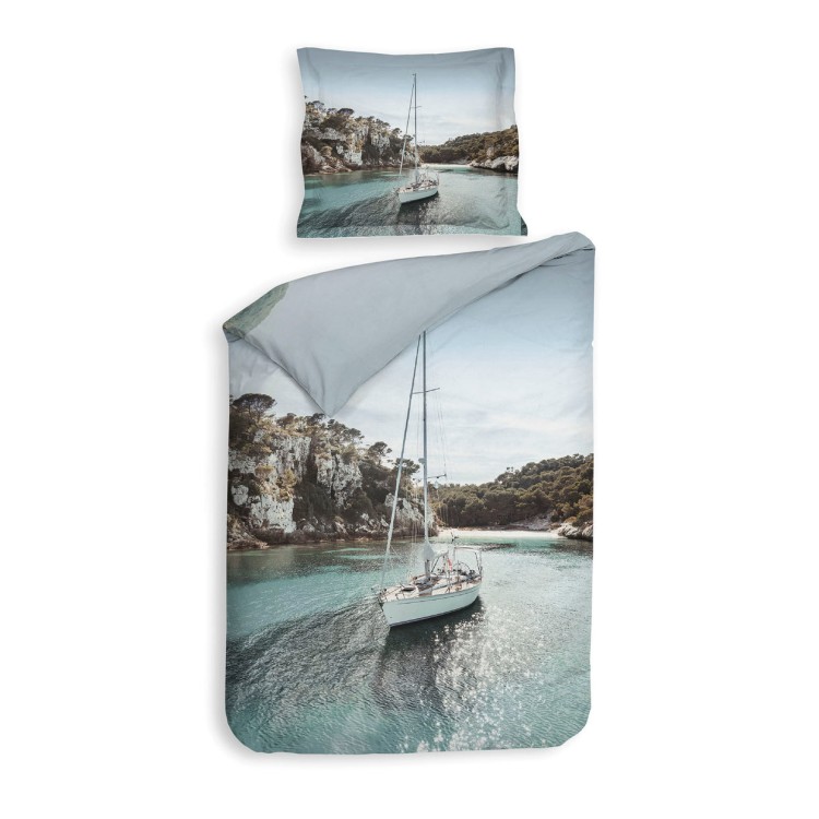 Träumen Sie unter dem Bettbezug Nada von Heckett & Lane. Wachen Sie auf und genießen Sie einen wunderschönen Blick über eine Bucht voller Boote und eine terrakottafarbene Stadt. Für einen Moment scheint es, als wäre man wirklich im Urlaub und habe diese atemberaubende Aussicht. Oder drehen Sie die Abdeckung um und genießen Sie ein Segelboot im azurblauen Wasser, umgeben von wunderschönen Felsen. Genieße die Stille um dich herum. Die Kissenbezüge sind ebenfalls mit beiden Drucken versehen und mit einer Oxford-Kante versehen.