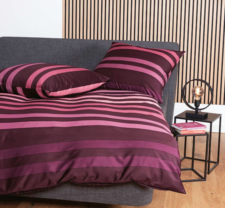 Die Bettwäsche präsentiert ein modisches, grafisches Design aus unterschiedlich starken Querstreifen. Der betörende Farbton Mauvewein in verschiedenen Nuancen verleiht der Mako-Satin-Garnitur eine warme Ausstrahlung, die Ihr Bett in eine Ruheoase verwandelt. Neben der modernen Farbgebung schafft der hochwertige Mako-Satin von Janine die perfekte Umgebung für erholsame Nächte. Der Stoff überzeugt mit seiner seidig glatten Haptik und hautsympathischen Eigenschaften, die Ihnen luxuriösen Komfort bietet und Sie gut schlafen lässt.