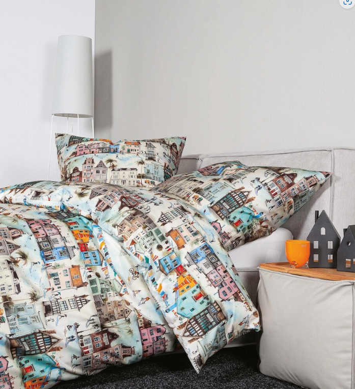Die Kombination aus bunten Reihenhäusern, schmalen Gassen und grünen Palmen lassen eine unbeschwerte Stimmung entstehen. Das verspielte Design der Bettwäsche bietet vielfältige Kombinationsmöglichkeiten und passt daher nahezu perfekt in jedes Schlafzimmer. Veredelt wird die Bettwäsche von Janine von den besonderen Eigenschaften des Mako-Satins. Das hochwertige Material legt sich wunderbar weich und leicht auf Ihre Haut und garantiert höchsten Komfort. Überzeugen Sie es selbst!