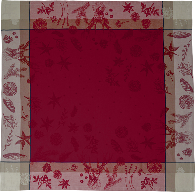 Jacquardgewebte Serviette mit Hirsch, Orangen, Tannenzapfen und Tannengrün - zauberhaft passend für den Winter, die Adventszeit und Weihnachten.