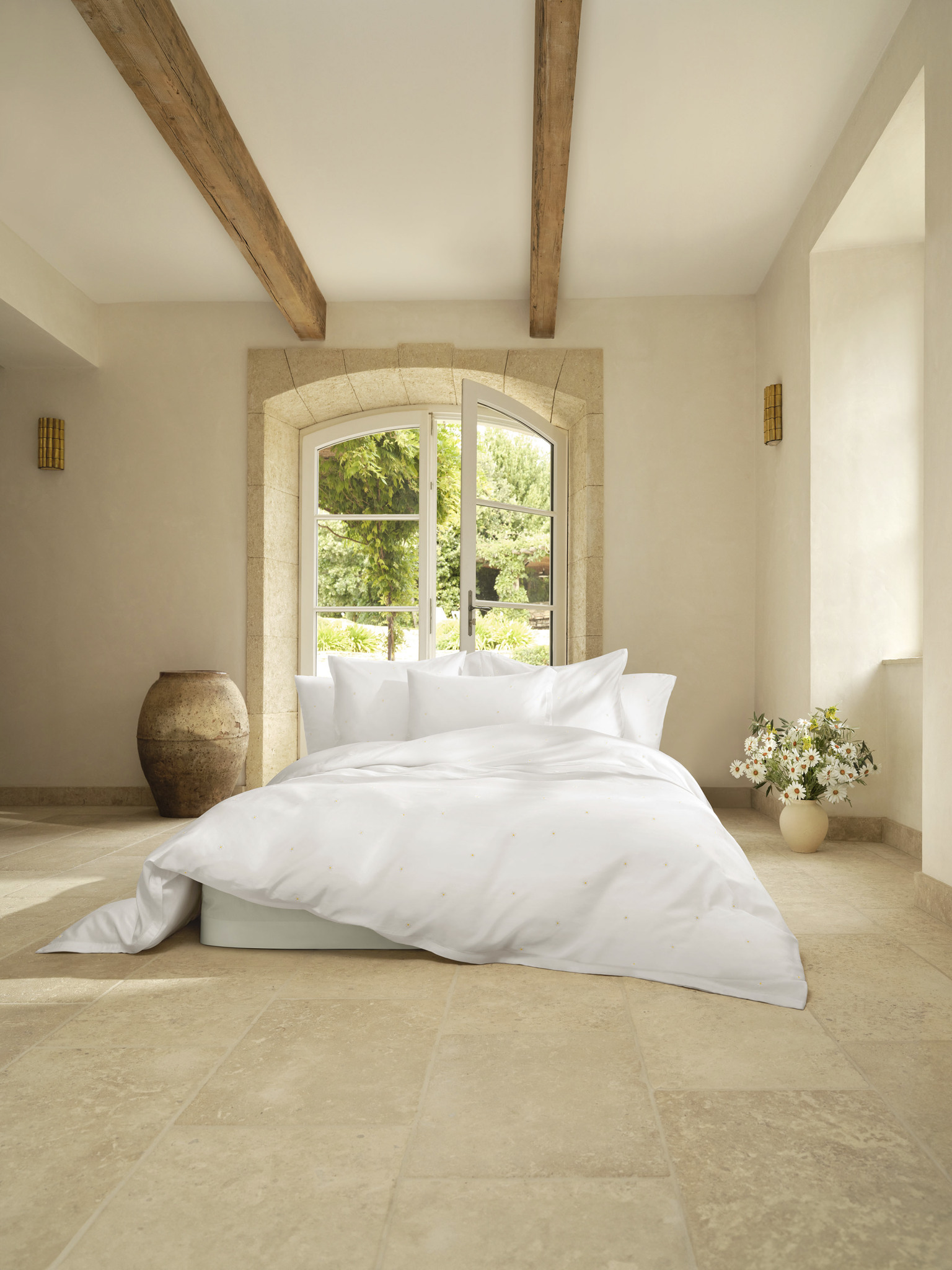 Wo die heimische Gartenwiese wie auch die eigene Bettwäsche die Erinnerungen an Blumenkronen und Sommerboten weckt, da bezaubert DAISY so lieblich, filigran und wunderbar leicht zugleich mit ihren aufgestickten Gänseblümchen – zierlich und erhaben tänzeln die kleinen Schmuckstücke auf der Oberseite über den reinweissen Satin, wird doch erst beim genauen Betrachten klar, wie individuell jede Blüte erscheint. Zeitlos, klassisch und elegant weht mit DAISY garantiert bald eine sanfte Brise Sommer hinein ins Schlafzimmer.