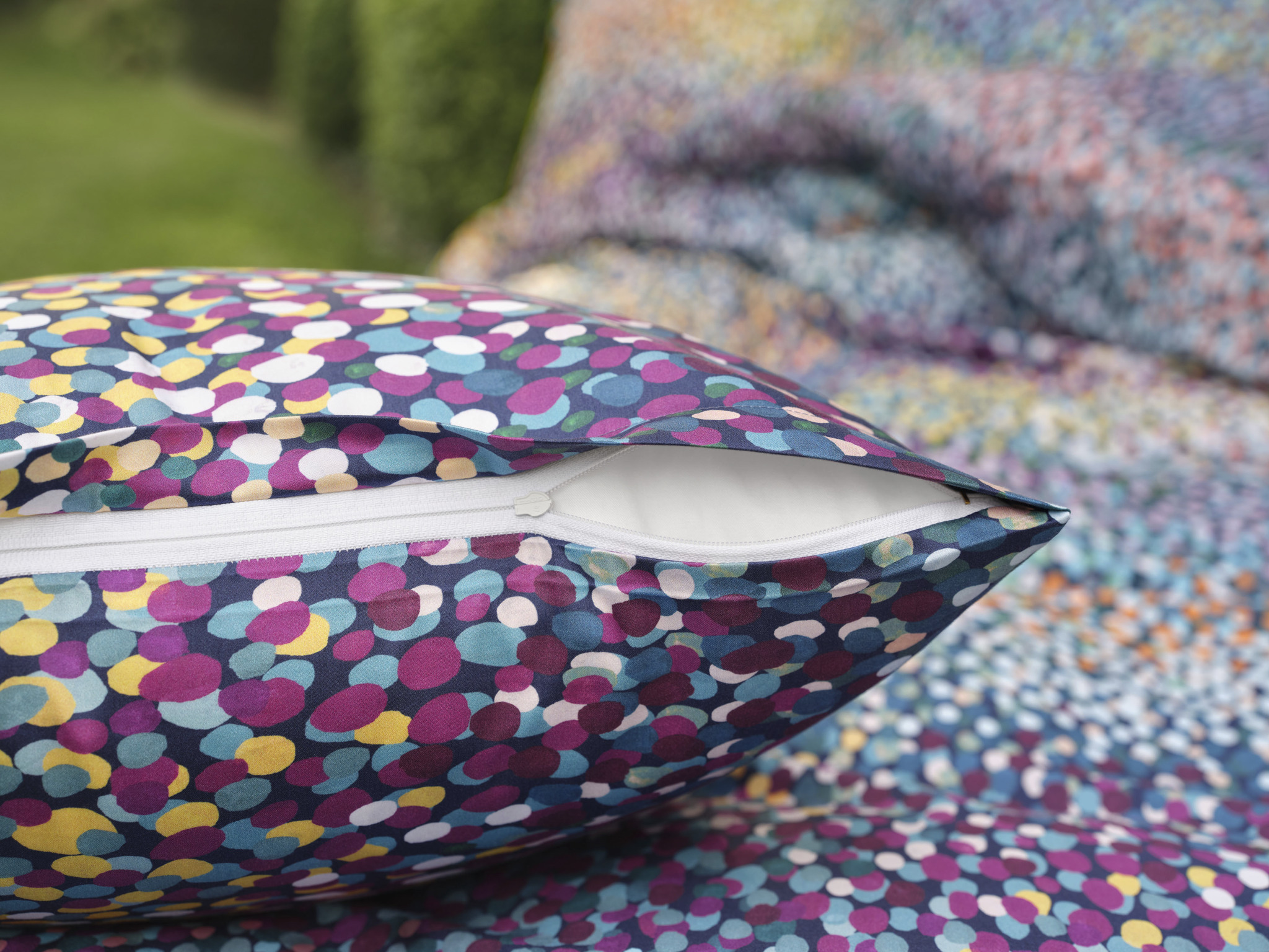Inspiriert von pointillistischen Gemälden oder auch dem Anblick einer blühenden Sommerwiese aus luftigen Höhen zieht die Bettwäsche JANA fast unwiderstehlich in ihren Bann und lädt dazu ein, in dieses berauschende Meer aus Farbtupfern einzutauchen. Zahlreiche Nuancen aus goldenem Ocker, samtigem Veilchenblau, silbernem Grau, Blau- und Grüntönen wollen von Nahem entdeckt werden und laden in den herrlich blühenden Garten ein – aufgetragen in Handarbeit und in mehreren Schichten entsteht auf dem leuchtend, dunkelblauen Hintergrund das organische, lebendige Design in Gouache.